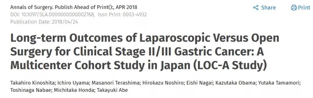 腹腔镜治疗进展期胃癌,一直存在临床争议,因为缺乏临床证据证明其疗效等同于开放手术。2018424日发表在《Annals of Surgery》一篇论文,给广大从事腹腔镜胃手术的医生,带来了喜讯。大家可以根据论文名字,在相关网站查阅。