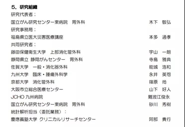 项目团队有临床医生和生物统计学家组成,日本8家医院参与了研究项目,日语表格图显示参加项目的各医院名和负责人名,以及生物统计学家。