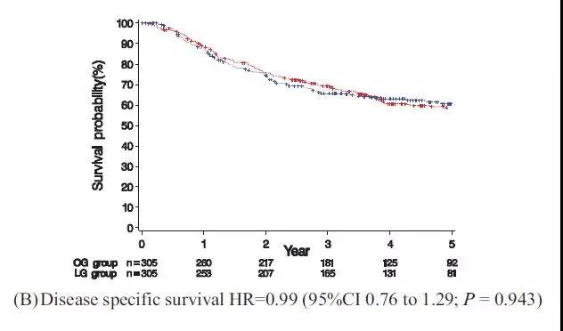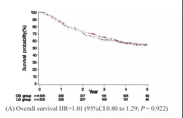 观察中位年数LG3.4年,OG3.5年,5年总体生存率LG54.2%OG53.0%,总体生存率风险比HR=1.0195%可信区间为0.80~1.29),说明几乎没有差异。