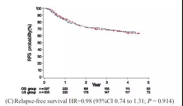 LG术后复发率为29.8%OG30.8%,复发率的风险比HR=0.98 95%可信区间为0.74-1.31),说明LGOG相当,而且在复发的形式上也相似。