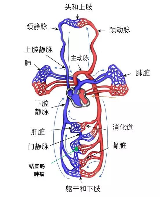 要回答这两个问题,我们先来了解一下结直肠肿瘤细胞在血管中流动情况。一些结直肠肿瘤细胞从原发病灶脱落,侵入血管,进入血流,这些细胞主要通过门静脉系统流入到肝脏,然后到达下腔静脉,同时也会有一些癌细胞通过阴部静脉或淋巴管路进入腔静脉,在此过程中,就有癌细胞留驻在肝脏,形成肝转移癌。